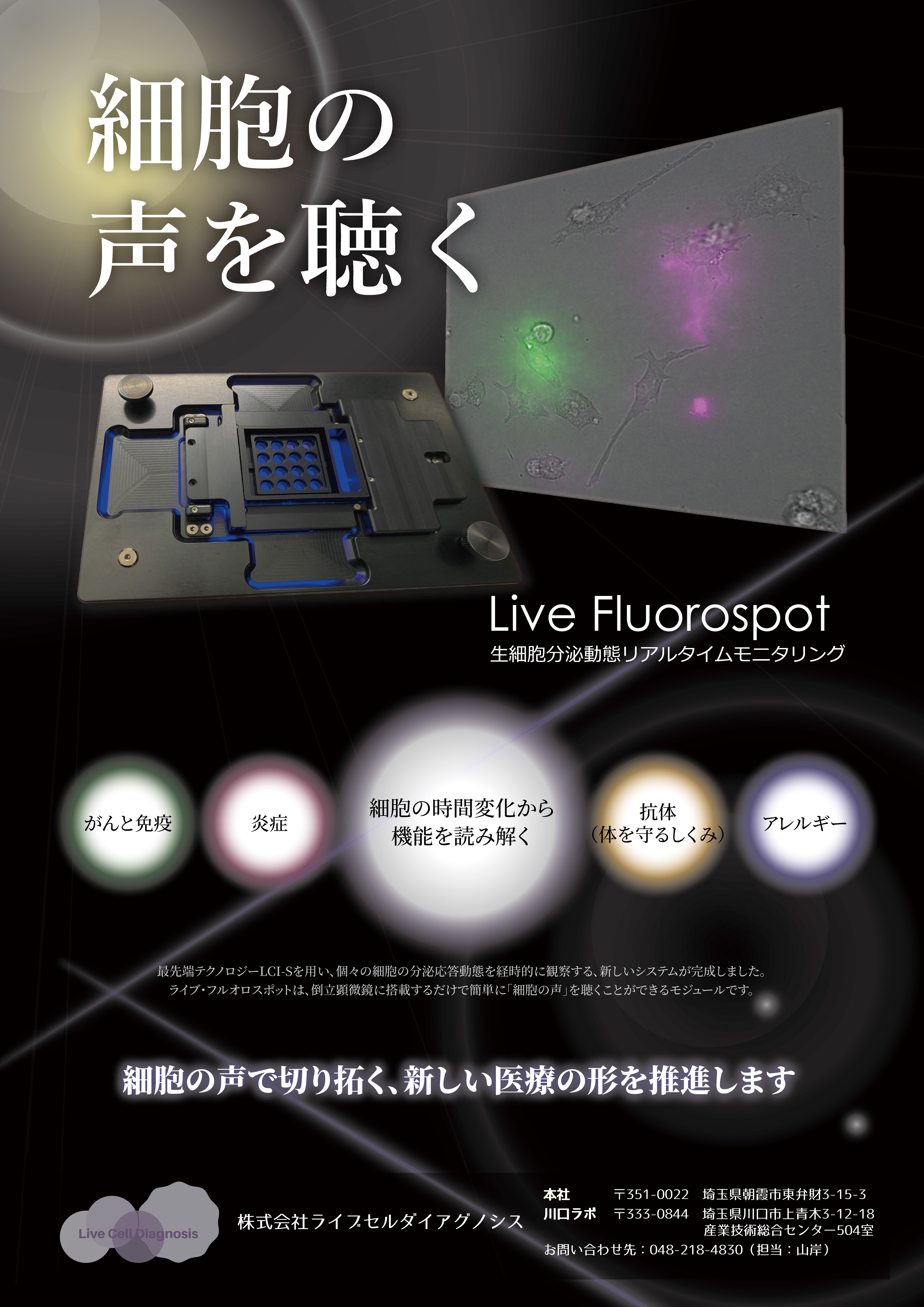 細胞分泌可視化モジュール「Live Fluorospot」は、細胞から放出されるサイトカインや抗体などの分泌活動を、単一細胞レベルでリアルタイムに可視化する技術です。
